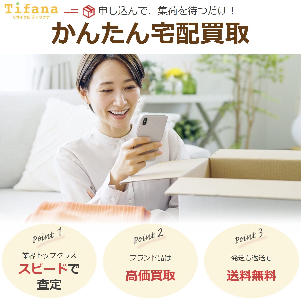 「ブランド品を売りたいけれど、どこに依頼すればいいか分からない」「忙しくて店舗に行く時間がない」「できるだけ簡単に査定してほしい」そんな方には、ティファナの宅配買取サービスがおすすめです。自宅から簡単に申し込みができ、専門スタッフによる丁寧な査定を受けられるため、安心して利用することができます。