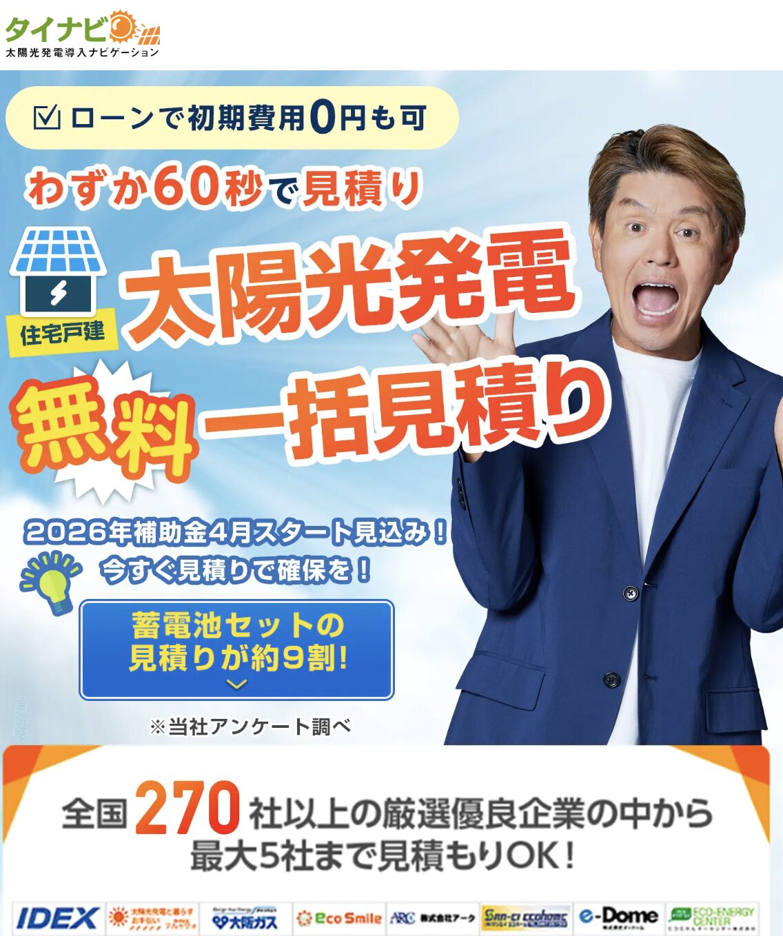 太陽光発電の導入を検討しているものの、「どこに相談すればいいのかわからない」「価格やサービスに差がありそうで不安」と感じている方は多いのではないでしょうか。そんな悩みを解決するのが、複数の優良業者を一括で比較できるサービスです。タイナビは、太陽光発電や蓄電池の導入を検討している方に向けて、最適な提案を受けられる無料の一括見積もりサービスとして、多くの利用者から支持されています。