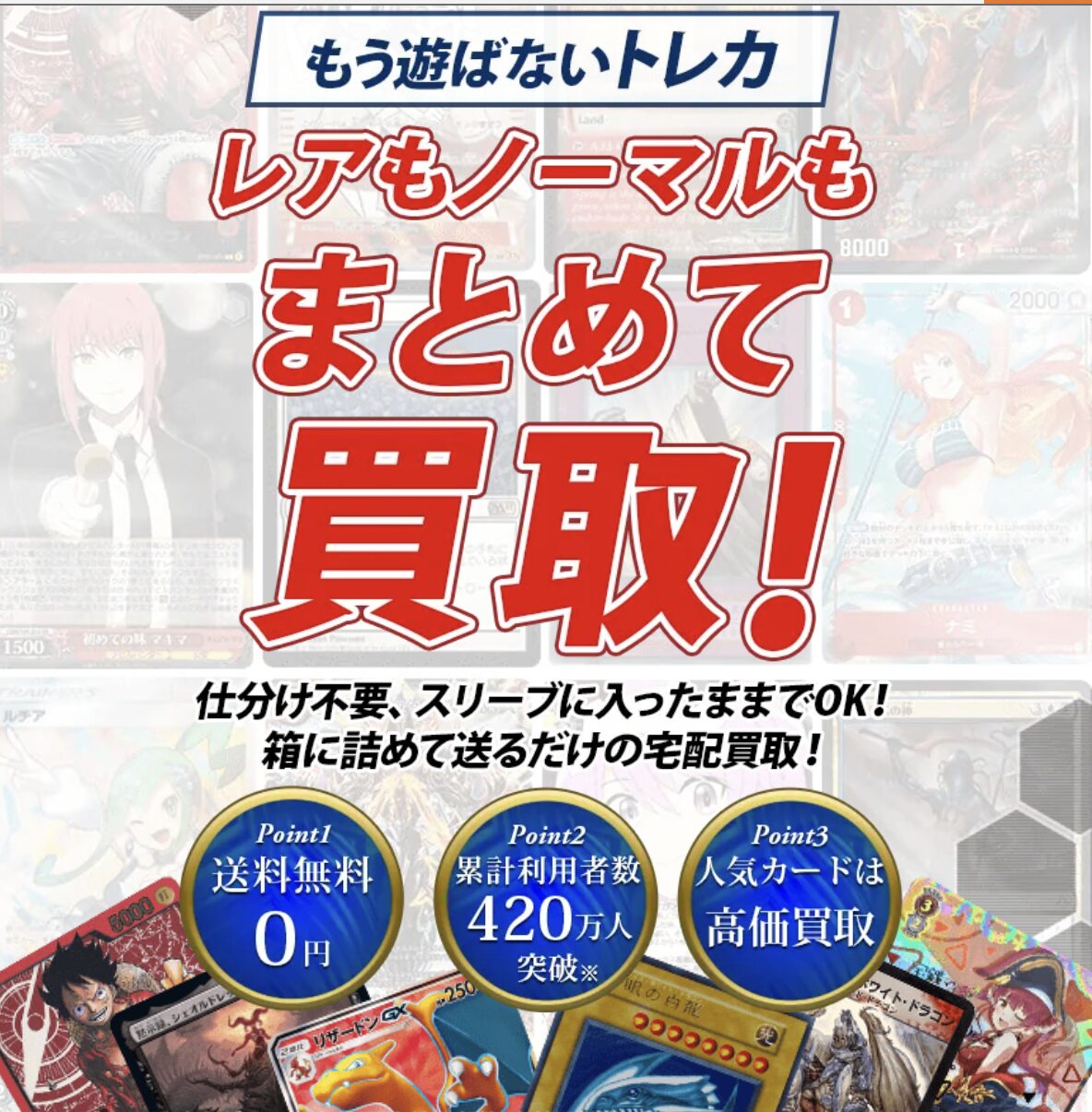 遊ばなくなったトレーディングカードや、コレクションしていたカードをまとめて売りたいと考えている方におすすめなのが、トレカ買取専門サービス「トレトク」です。トレトクは、宅配買取に特化したサービスであり、全国どこからでも簡単に利用できる利便性と、専門査定による高価買取が魅力です。大量のカードでも手間なく売却できるため、多くのユーザーに選ばれています。