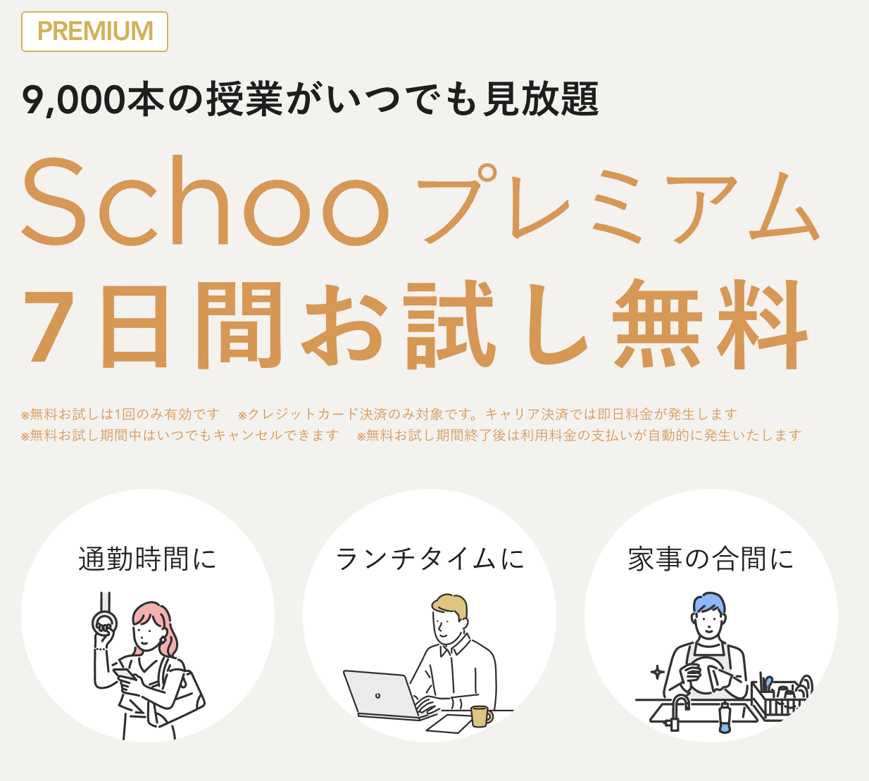 Schooプレミアムサービスは、特別な才能がある人だけのものではありません。コツコツと学び続ける意思さえあれば、誰でもスキルを磨き、自分の可能性を広げることができます。スキマ時間を“消費”ではなく“成長”に変える。その一歩が、あなたのキャリアの未来を大きく変えていきます。