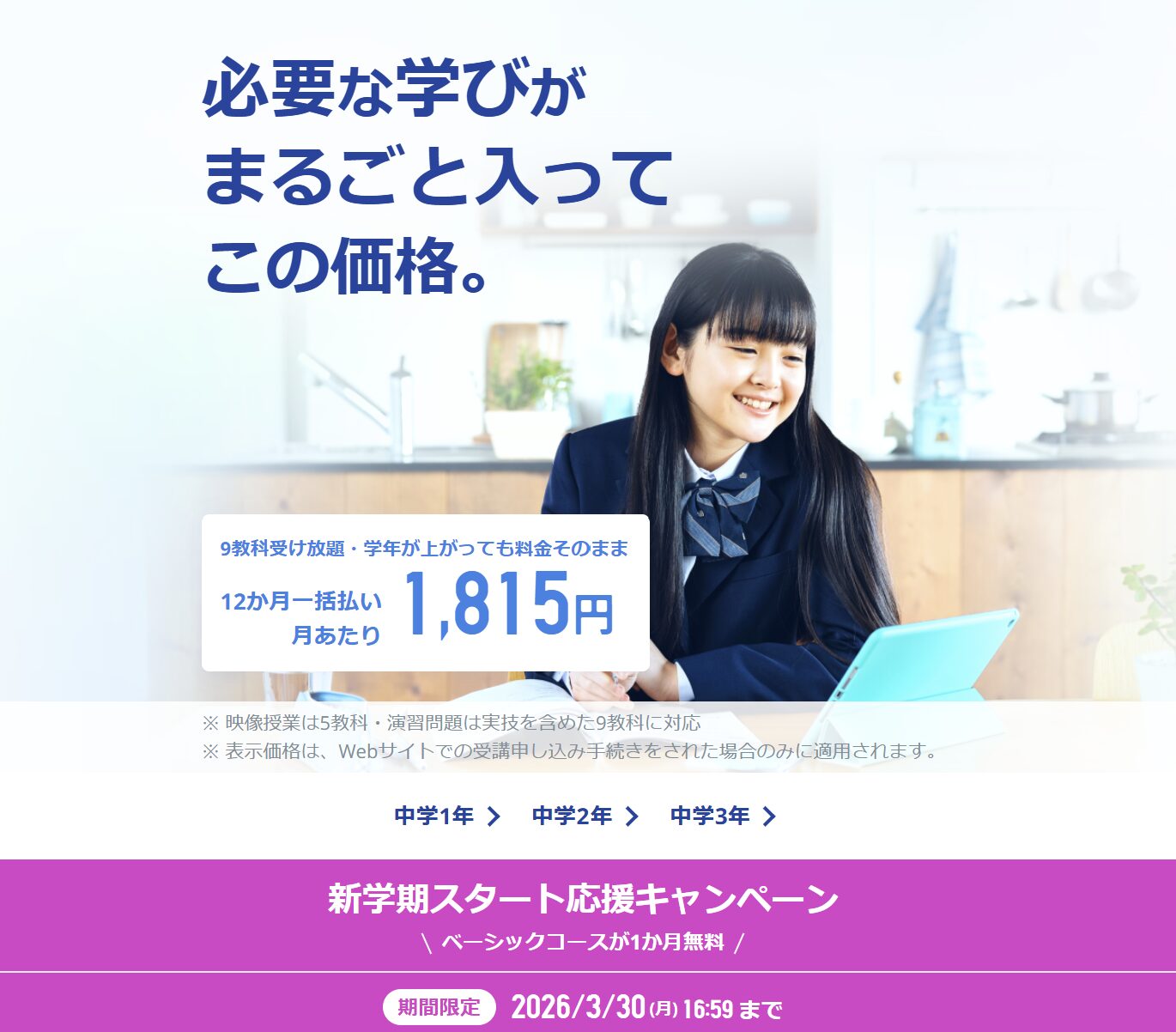「今の成績を本気で変えたい」「志望校合格に向けて一歩リードしたい」そう考えているなら、日々の学習環境を見直すことが重要です。スタディサプリ中学講座は、ただ授業を配信するだけでなく、自宅学習を習慣化し、着実に学力を積み上げていく仕組みが整っています。自分のペースで、しかし確実に前へ進む。その積み重ねが、定期テストの点数アップや志望校合格という大きな成果へとつながっていきます。