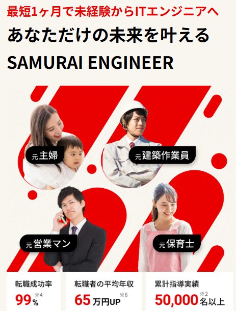 SAMURAI ENGINEERは、「本気で人生を変えたい」「手に職をつけて将来の不安をなくしたい」と考える方にとって、最適な学習環境を提供するスクールです。未経験からでも一歩ずつ着実に成長できる仕組みが整っているため、これまで挑戦できなかった方でも安心してスタートできます。自分の可能性を広げ、新しいキャリアを切り拓きたい方は、ぜひこの機会に一歩踏み出してみてください。