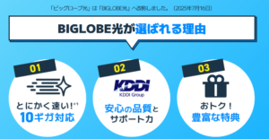 BIGLOBE光は、「安定したインターネット環境をできるだけお得に使いたい」「通信費を見直したい」と考えている方におすすめの光回線サービスです。老舗プロバイダとして長年の実績を持つBIGLOBEが提供しているため、安心感と信頼性の高さが大きな魅力となっています。