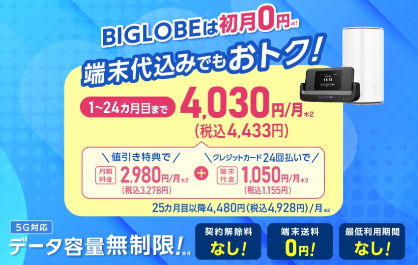 さらに、BIGLOBE WiMAXは料金面でも魅力があり、キャンペーンや割引を活用することでお得に利用できるのもポイントです。初期費用を抑えつつ、毎月の通信費もバランスよく節約できるため、「コストも重視したい」という方にも向いています。