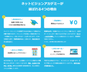 ネットビジョンアカデミーは、「未経験からITエンジニアになりたい」「手に職をつけて安定したキャリアを築きたい」と考えている方に向けた、無料で学べるITスクール兼就職支援サービスです。ネットワークエンジニアに特化したカリキュラムと、就職サポートがセットになっているため、知識ゼロからでも最短でエンジニア就職を目指せるのが大きな特徴です。