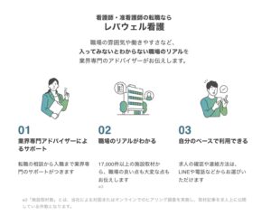 さらに、「看護のお仕事」は転職を急いでいない人でも利用できる点が特徴です。「今すぐ転職するか迷っている」「まずは情報収集だけしたい」といった段階でも相談可能であり、自分のペースでキャリアを考えることができます。近年では、LINEなどを通じた気軽な相談にも対応しており、忙しい看護師でも無理なく利用できる環境が整っています。