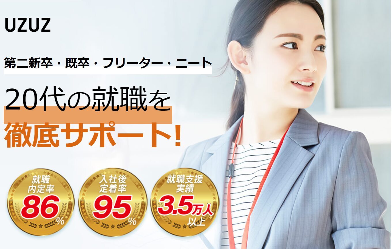 UZUZは、20代の第二新卒・既卒・フリーター専門の就職支援サービスです。通常の就職活動では、経験不足や学歴に不安を感じる方も多いですが、UZUZはそのような方々に特化したサポート体制を整えています。専任のキャリアアドバイザーが一人ひとりに寄り添い、あなたの強みや適性を引き出すことで、企業とのマッチング精度を高めます。結果、最短10日で内定を獲得した実績もあり、効率的かつ安心して就職活動を進められます。