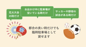 また、1日単位で貸し出せるため、自分の生活スタイルに合わせた柔軟な運用が可能です。「平日は使うけど土日は空いている」「日中は空いているが夜は使う」など、細かな設定ができるため無理なく続けられます。使わない時間だけを収益化できるので、本業やプライベートに負担をかけることもありません。